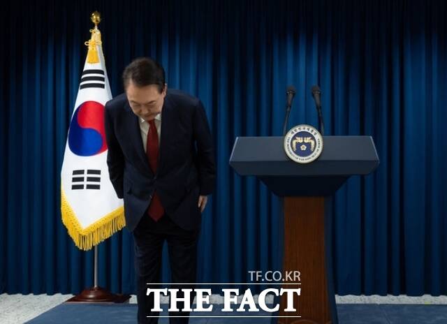 윤석열 대통령이 7일 서울 용산 대통령실 청사에서 국회 본회의 대통령 탄핵소추안 표결을 앞두고 대국민 담화를 발표하며 고개를 숙여 사과하고 있다. /대통령실 |