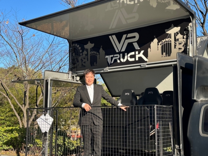 권종수 브이리스브이알 대표가 지난 3일 경기 부천 영상만화진흥원에 세워진 VR트럭에 탑승한 모습. /사진=브이리스브이알 |