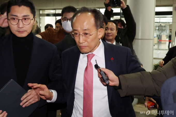 사퇴 의사를 밝힌 추경호 국민의힘 원내대표가 7일 오후 서울 여의도 국회에서 열린 의원총회가 끝난 뒤 나서고 있다. 이날 본회의에 상정된 윤석열 대통령에 대한 탄핵 소추안은 국민의힘 표결 불참에 따른 의결정족수(200명) 미달로 '투표 불성립'으로 투표 종료 선언됐다. 2024.12.07. /사진=뉴시스 |
