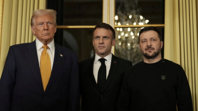 (왼쪽부터) 도널드 트럼프 미국 대통령 당선인, 에마뉘엘 마크롱 프랑스 대통령, 볼로디미르 젤렌스키 우크라이나 대통령이 7일(현지시간) 프랑스 파리 엘리제궁에서 회동하고 있다. /AFPBBNews=뉴스1 |