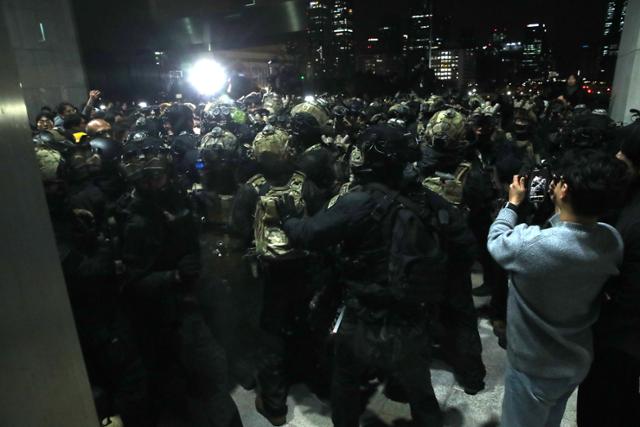 윤석열 대통령이 비상계엄령을 선포한 가운데 4일 새벽 서울 여의도 국회 본청 앞에서 경내로 진입하려는 계엄군과 국회 관계자들이 몸싸음을 벌이고 있다. 뉴스1 |