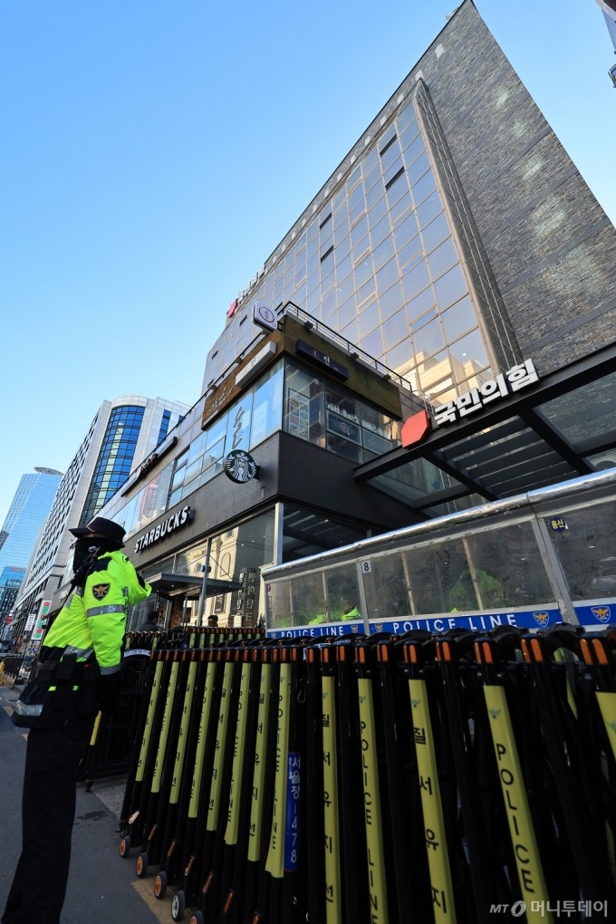 윤석열 대통령의 '비상계엄' 무리수가 탄핵 정국으로 이어지고 있는 8일 서울 여의도 국민의힘 당사 앞에 경찰의 오물투척 방지 가림막이 설치되어 있다. 2024.12.8/뉴스1 Copyright (C) 뉴스1. All rights reserved. 무단 전재 및 재배포, AI학습 이용 금지. /사진=(서울=뉴스1) 박정호 기자 |