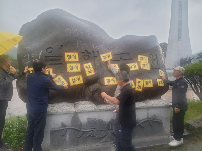 '생명의 숲 되찾기 합천군민운동본부'가 일해공원 표지석에 철거 스티커를 붙인 모습./사진=뉴시스(생명의 숲 되찾기 합천군민운동본부 제공) |