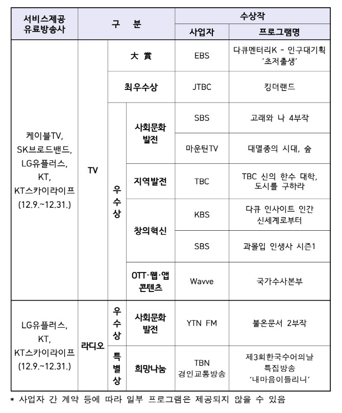 방송대상 특별관은 ‘2024 방송통신위원회 방송대상’에서 대상, 최우수상, 우수상으로 선정된 10개 프로그램들을 시청할 수 있도록 구성된 서비스다. 이날부터 각 유료방송사의 ‘TV 다시보기’ 메뉴를 통해 시청할 수 있다. 프로그램 제작 방송사와 홈초이스, SK브로드밴드, LG유플러스(032640), KT(030200) 및 KT(030200)스카이라이프의 협조를 통해 마련됐다.