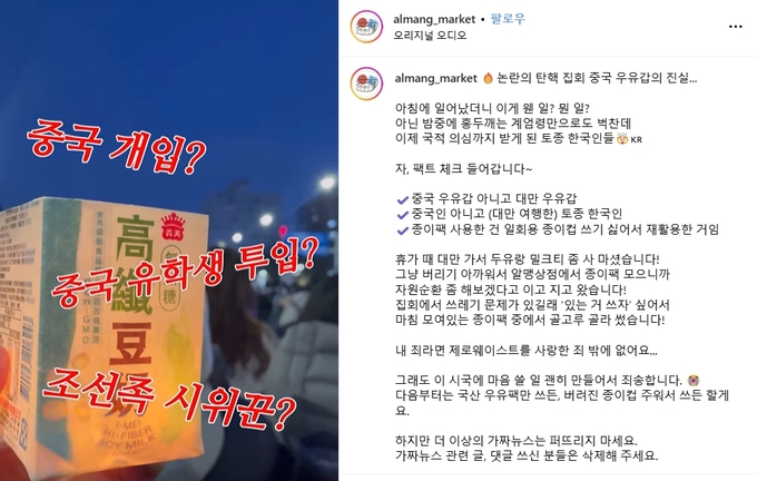 한 누리꾼은 “윤석열 탄핵 집회에 등장한 중국 우유팩”이라며 “간첩이 이렇게나 많다”고 주장했고, 다른 누리꾼은 “중국인들이 왜 남의 나라 일에 참견이냐”며 “집회나 시위가 하고 싶으면 너네 나라로 가라”고 반응했다.