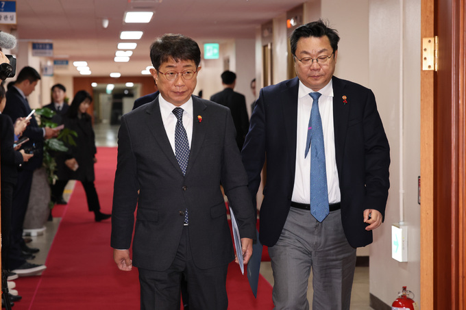 박상우(왼쪽) 국토부 장관을 비롯한 국무위원들이 지난 8일 오후 서울 종로구 정부서울청사에서 열린 국무위원 간담회에 참석하기 위해 입장하고 있다. 공동취재 |