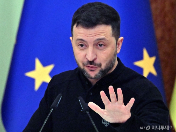 볼로디미르 젤렌스키 우크라이나 대통령이 1일 (현지시간) EU 지도부가 출범한 첫날 키이우를 방문한 안토니우 코스타 EU 정상회의 상임의장과 기자회견을 갖고 "생존을 위해서는 우크라이나의 나토 가입 초청이 필요하다"고 밝히고 있다./AFPBBNews=뉴스1 |