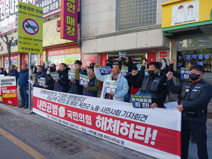 옥천군노동자협의회는 10일 오전 11 충북 옥천군 옥천읍 국민의힘 박덕흠 의원(보은·옥천·영동·괴산) 옥천 사무실 앞에서 기자회견을 하고 “내란수괴 윤석열과 내란범 국민의 힘은 해체하라”고 촉구했다.