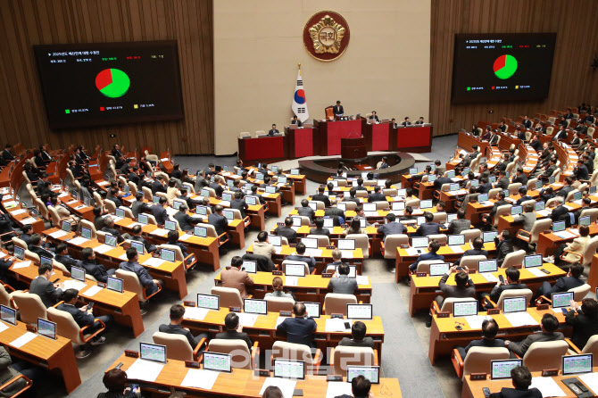 [이데일리 노진환 기자] 10일 오후 서울 여의도 국회에서 열린 제418회 국회(정기회) 제18차 본회의에서 ‘2025년도 예산안에 대한 수정안’이 가결되고 있다. |