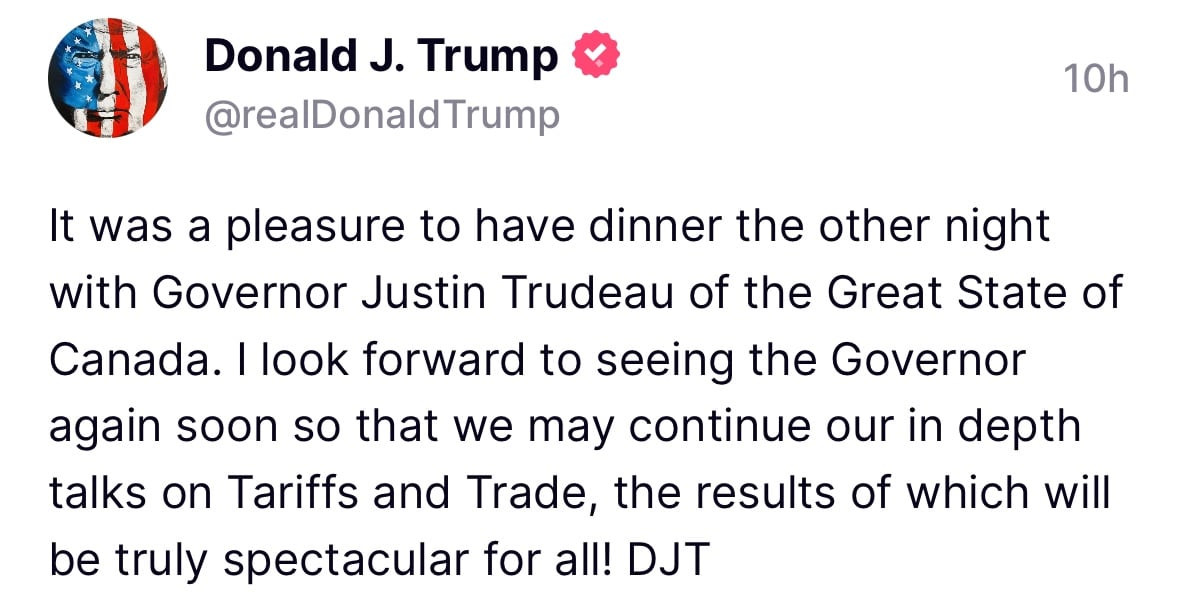도널드 트럼프 당선인은 10일 새벽 소셜미디어에 올린 글에서 캐나다를 '주(州)', 캐나다 총리를 '주지사'로 불렀다./트루스소셜 |