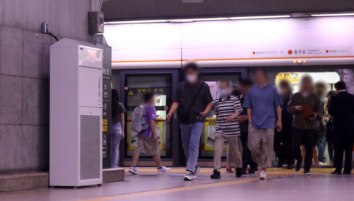 서울의 한 지하철역에서 공기청정기가 가동되고 있다. 뉴시스 |