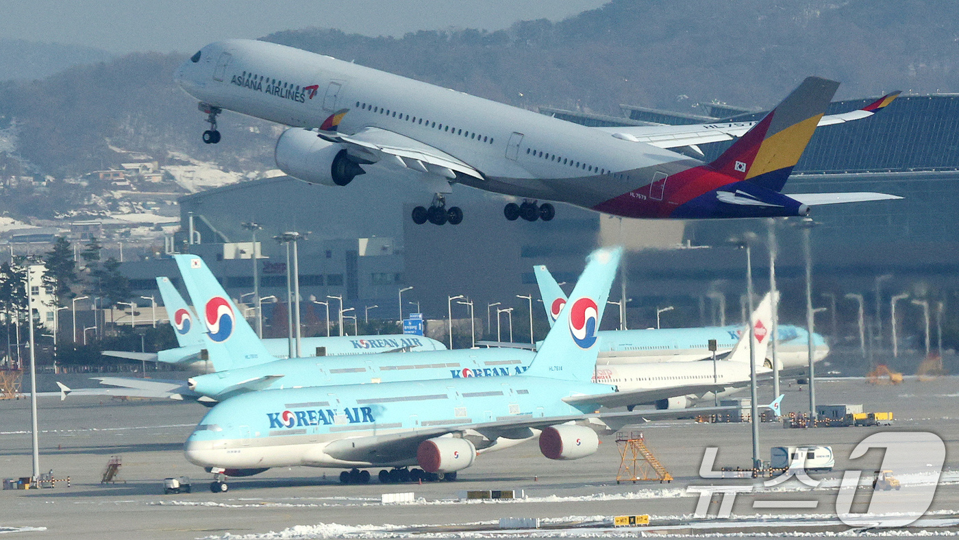 29일 오전 인천국제공항에서 아시아나 항공기가 대한항공 항공기 위로 이륙하고 있다. 2024.11.29/뉴스1 ⓒ News1 장수영 기자 |
