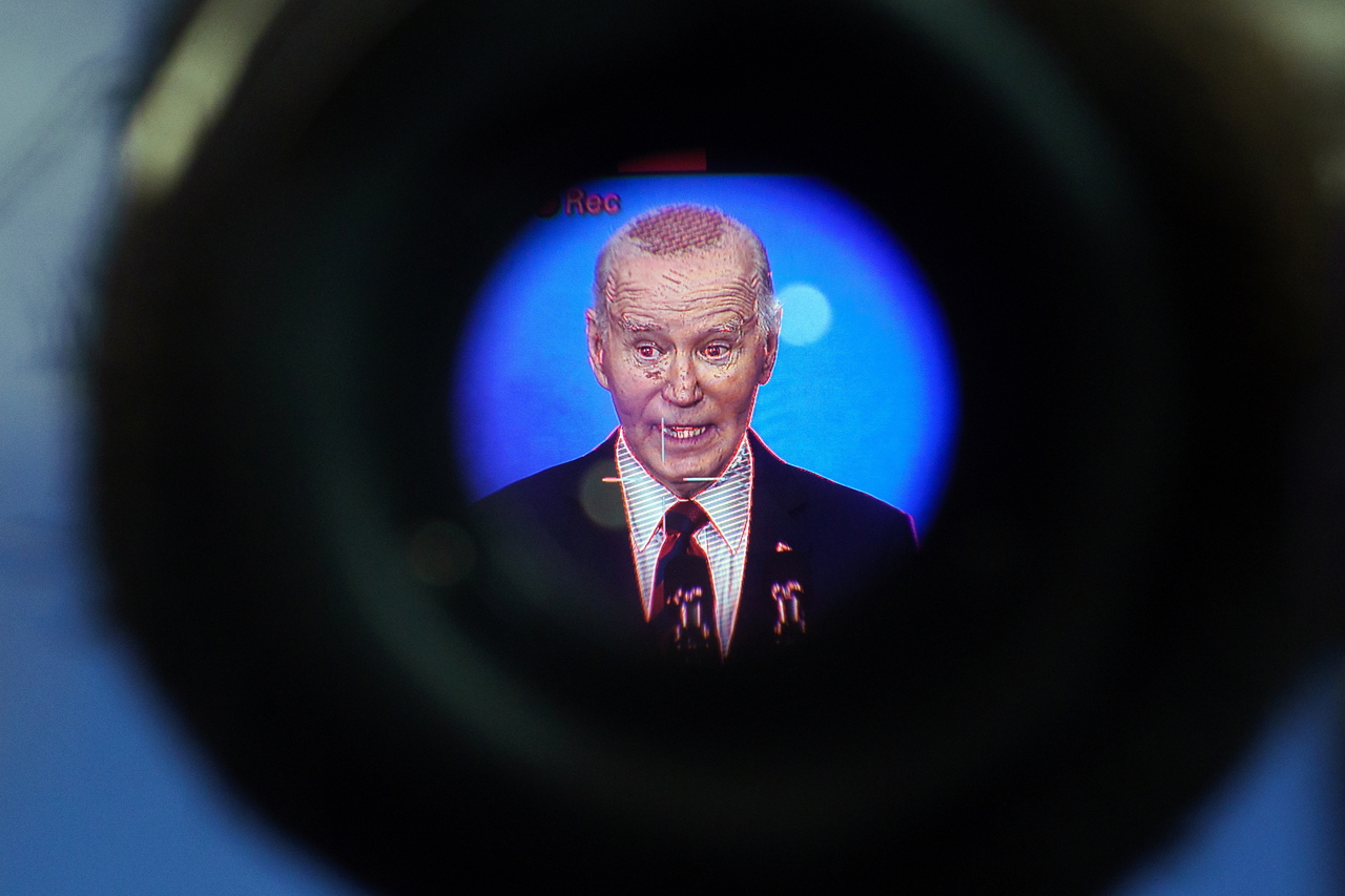 조 바이든 미국 대통령이 10일(현지시간) 미 워싱턴 DC 소재 브루킹스연구소에서 연설하는 장면이 카메라 뷰파인더에 잡히고 있다.[EPA] |