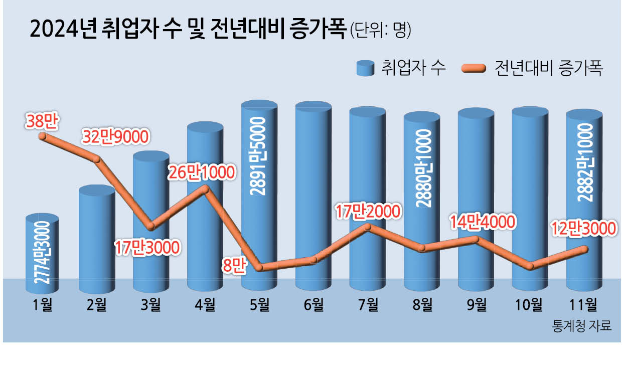 11일 통계청이 발표한 ‘11월 고용동향’에 따르면 지난달 15세 이상 취업자는 2882만1000명으로 작년 11월보다 12만3000명 증가했다. 취업자 수 증가폭이 전년 대비 10만명도 되지 않았던 10월(8만3000명)보다 4만명 증가했지만 전반적인 고용부진은 지속되고 있다.