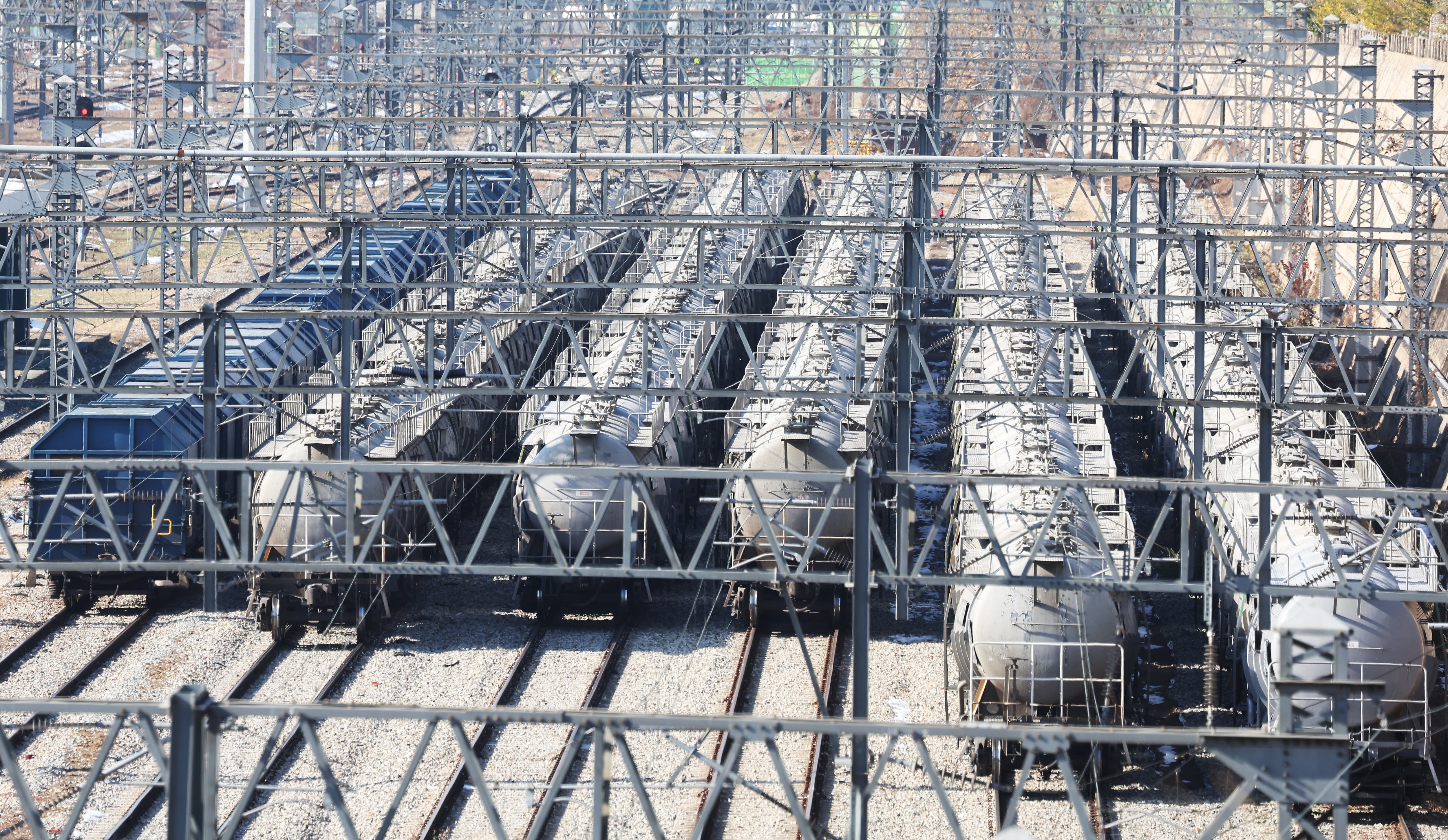 전국철도노동조합 총파업 닷새째인 9일 경기도 의왕시 오봉역에 시멘트 운송 열차가 정차해 있다. /연합뉴스 |