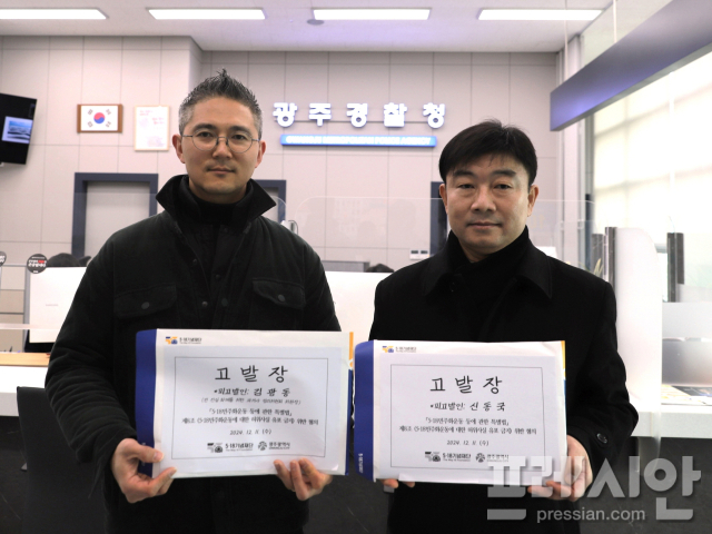 ▲(왼쪽부터)최경훈 5·18기념재단 기록진실부 팀장과 김대인 광주시 5·18민주과 진상규명팀장이 11일 광주경찰청에서 김광동 전 진실·화해를 위한 과거사 정리위원회 위원장과 신동국 뉴 그루터기 출판사에 대한 고발장을 들고 있다. 2024.12.11ⓒ광주시 |