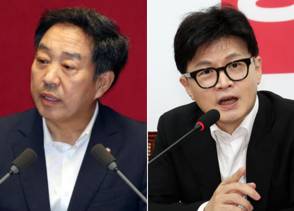 강승규(왼쪽) 국민의힘 의원과 한동훈 국민의힘 대표. 뉴시스 |