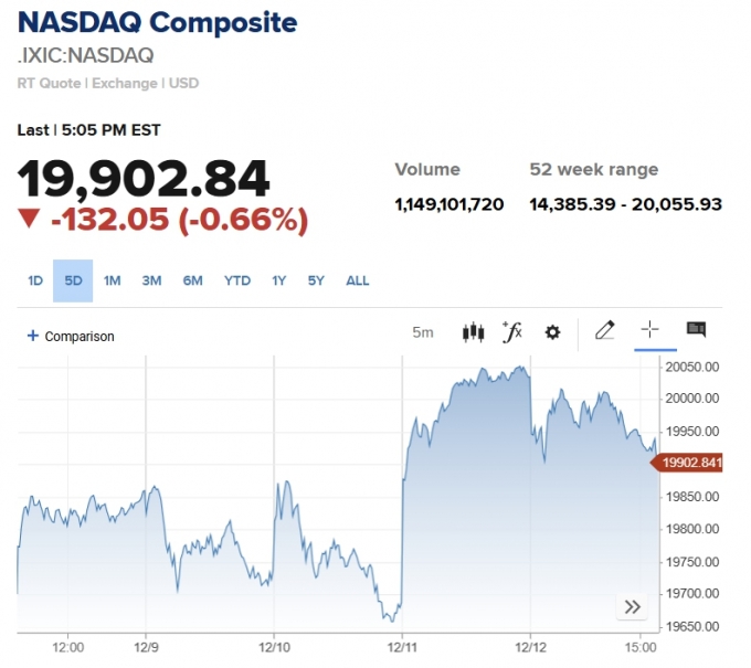 뉴욕증시가 전일 기술주 급등 하루만에 다시 하락세로 톤다운 됐다. 소비자물가에 이어 나온 도매물가가 예상보다 높다는 소식에 전일 주요주 상승폭이 과했다는 자제심리도 발동한 것으로 보인다. 전일 2만선을 사상처음으로 돌파했던 나스닥 지수도 다시 19,900대로 내려 앉았다.
