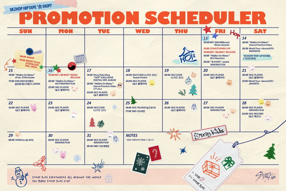 스트레이 키즈는 13일 새로운 형식의 앨범 SKZHOP HIPTAPE(스키즈합 힙테이프) '合 (HOP)'과 타이틀곡 'Walkin On Water'(워킨 온 워터)를 발매한다. 발매를 하루 앞둔 12일 오후에는 공식 SNS 채널에 신보 프로모션 일정을 한눈에 볼 수 있는 스케줄러 이미지를 게재하고 분위기를 달궜다.