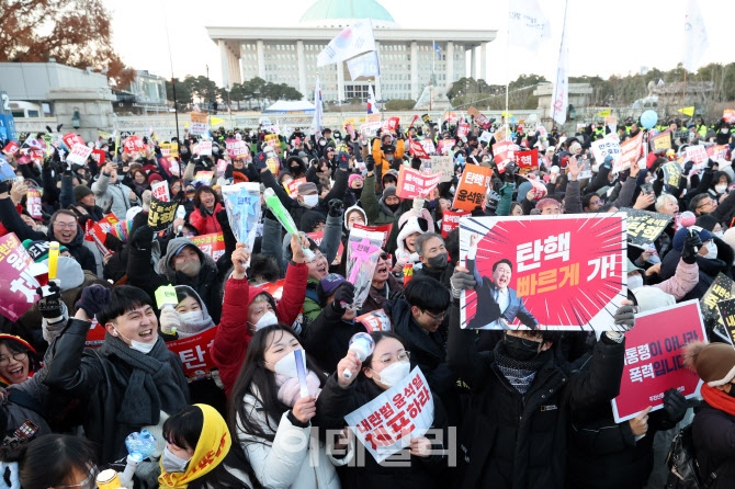 [이데일리 방인권 기자] 윤석열 대통령에 대한 탄핵소추안이 가결된 14일 오후 서울 여의도 국회의사당 앞에서 열린 윤석열 즉각 탄핵 범국민 촛불대행진에 참여한 시민들이 환호하고 있다. |