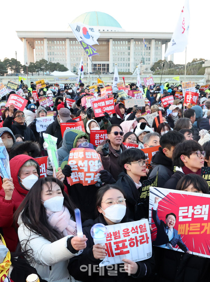 [이데일리 방인권 기자] 윤석열 대통령 탄핵소추안 국회 재표결이 진행되고 있는 14일 서울 여의도 국회의사당 앞에서 열린 촛불집회에 참가한 시민들이 탄핵 구호를 외치고 있다. |