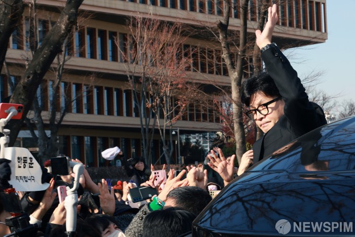 [서울=뉴스핌] 이형석 기자 = 한동훈 국민의힘 대표가 16일 오전 서울 여의도 국회에서 당대표 사퇴 기자회견을 마치고 이동하던 중 지지자들에게 인사를 하고 있다. 2024.12.16 leehs@newspim.com
