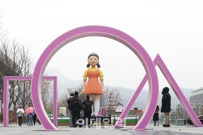 [이데일리 이영훈 기자] 16일 서울 종로구 광화문광장에 설치된 넷플릭스 드라마 '오징어게임' 캐릭터 '영희' 조형물 앞에서 시민들이 사진을 찍고 있다.