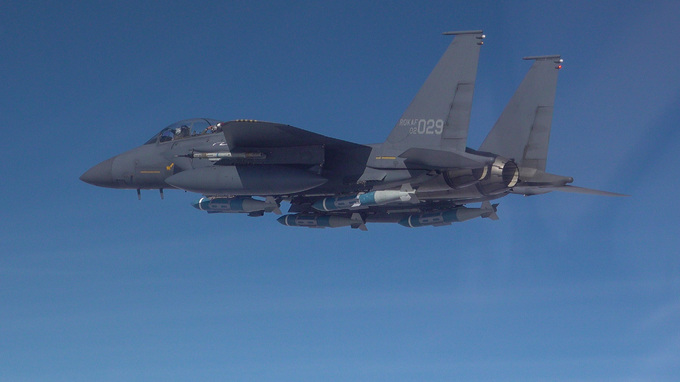 F-15K가 호주 다윈기지 상공에서 지상목표물을 향해 GBU-31 공대지 폭탄 4발을 투하하고 있다. 공군 제공 |