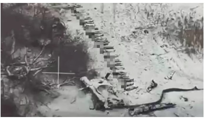 우크라이나군이 지난 14일(현지시간) 러시아군과 북한군의 시신이라며 공개한 사진. 우크라인스카 프라우다 캡쳐 |