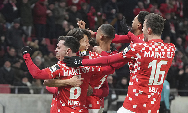 마인츠의 이재성(왼쪽 두 번째)이 14일(현지시) 독일 마인츠의 메바 아레나에서 열린 2024-25 분데스리가 14라운드 바이에른 뮌헨과의 경기 후반 15분 추가 골을 넣은 후 동료들과 기쁨을 나누고 있다. AP뉴시스 |