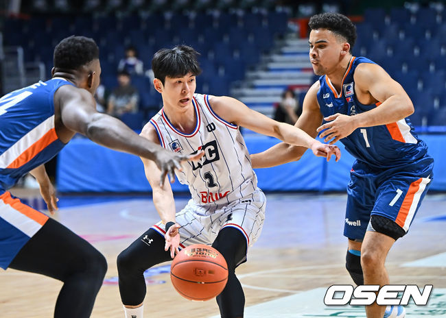 부산 KCC 이호현이 메랄코볼츠 BLACK Norman, KOUAME Kakou의 마크를 피해 패스하고 있다. 2024.12.18 / foto0307@osen.co.kr