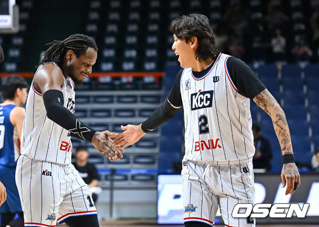 부산 KCC 디온테 버튼이 골을 성공시키고 최준용과 하이파이브를 하고 있다. 2024.12.18 / foto0307@osen.co.kr