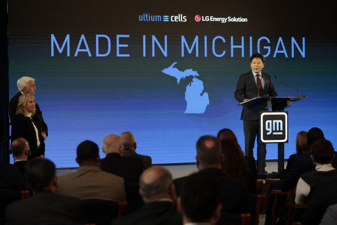 김동명 LG에너지솔루션 사장이 2022년 제너럴모터스(GM)과 합작 투자해 미국 미시간주에 배터리 공장을 짓겠다고 발표하고 있다. (사진=AFP) |