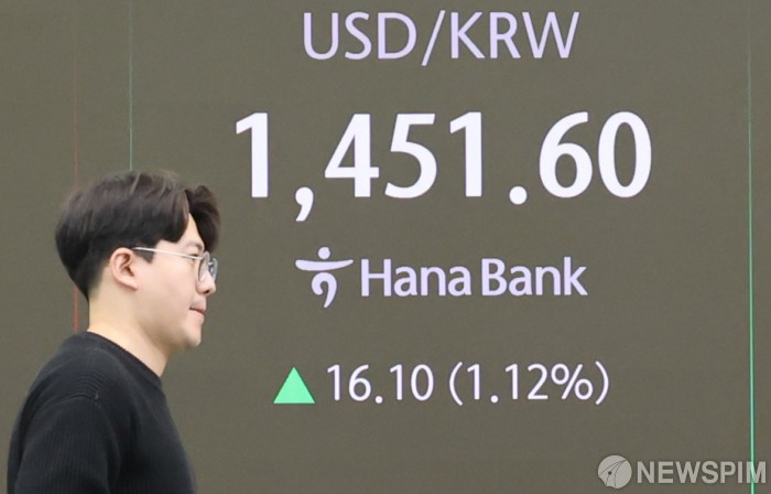 [서울=뉴스핌] 양윤모 기자 = 미 연방준비제도(연준)가 기준금리 인하 속도를 조절할 것임을 시사하자 뉴욕 증시가 급락한 가운데, 19일 오전 9시 코스피지수가 전 거래일 종가보다 58.51포인트(-2.36%) 하락한 2,425.92로, 코스닥지수는 16.24포인트(-2.33%) 하락한 681.33으로 오전 거래를 시작했다. 서울 외환시장에서 달러/원 환율은 전 거래일보다 16.70원(1.16%) 상승한 1,452.20원에 오전 거래를 시작한 가운데, 서울 중구 하나은행 딜링룸에서 직원들이 업무를 보고 있다. 2024.12.19 yym58@newspim.com
