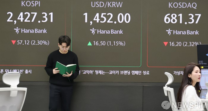 [서울=뉴스핌] 양윤모 기자 = 미 연방준비제도(연준)가 기준금리 인하 속도를 조절할 것임을 시사하자 뉴욕 증시가 급락한 가운데, 19일 오전 9시 코스피지수가 전 거래일 종가보다 58.51포인트(-2.36%) 하락한 2,425.92로, 코스닥지수는 16.24포인트(-2.33%) 하락한 681.33으로 오전 거래를 시작했다. 서울 외환시장에서 달러/원 환율은 전 거래일보다 16.70원(1.16%) 상승한 1,452.20원에 오전 거래를 시작한 가운데, 서울 중구 하나은행 딜링룸에서 직원들이 업무를 보고 있다. 2024.12.19 yym58@newspim.com