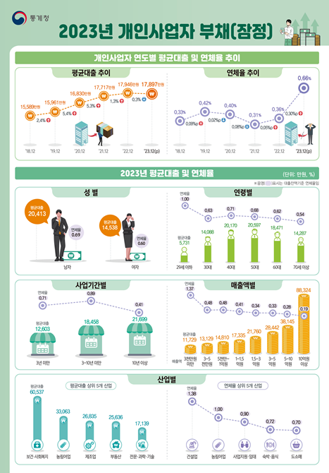통계청이 19일 발표한 '2023년 개인사업자 부채(잠정)'에 따르면 지난해 12월 말 기준 개인사업자의 연체율(대출잔액 기준)은 0.66%로 1년 전보다 0.30%포인트(p) 상승했다. 이는 관련 통계가 작성된 2017년 이래 가장 높은 수치다.