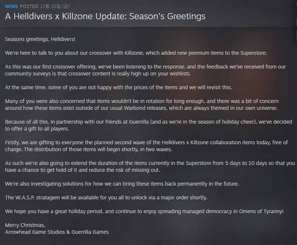 애로우헤드 게임 스튜디오는 20일 헬다이버즈2와 킬존2의 컬래버 아이템 2차 물량을 이용자들에게 무료로 배포하겠다는 공지를 올렸다. 해당 배포는 2차례에 걸쳐 진행될 예정이다.