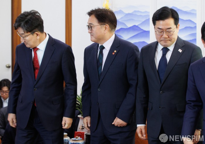 [서울=뉴스핌] 윤창빈 기자 = 우원식 국회의장, 권성동 국민의힘 대표 권한대행 겸 원내대표, 박찬대 더불어민주당 원내대표가 23일 오전 서울 여의도 국회 의장실에서 양당 원내대표 회동을 갖고 기념촬영을 마치고 자리로 향하고 있다. 2024.12.23 pangbin@newspim.com