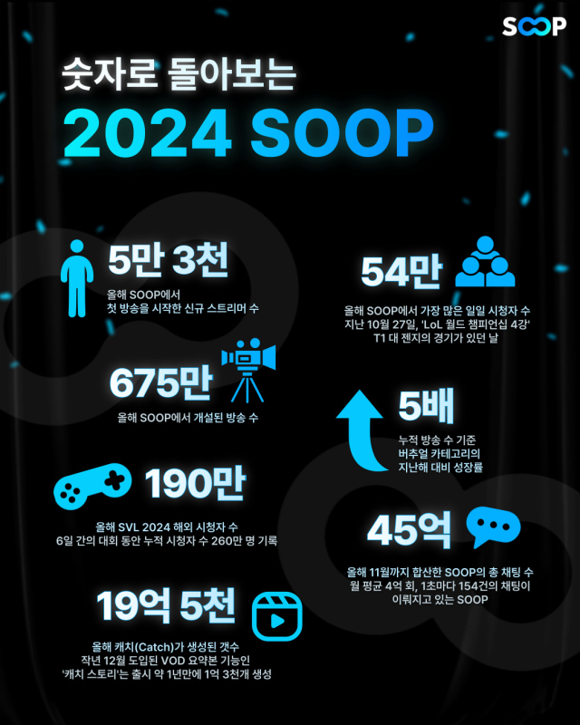 올해 플랫폼 내에서 첫 방송을 시작한 스트리머 수가 5만 3000명으로 작년 대비 35% 늘었다. SOOP은 올해 사명과 서비스명을 기존 아프리카TV에서 현재 명칭으로 변경하고, 새로운 사용자환경(UI)을 선보이며 플랫폼 전반을 개편했다. SOOP은 새롭게 방송을 시작하거나 다른 플랫폼에서 넘어온 스트리머의 안정적인 정착 지원을 위해 다양한 지원 프로그램과 신규 콘텐츠를 선보였다.