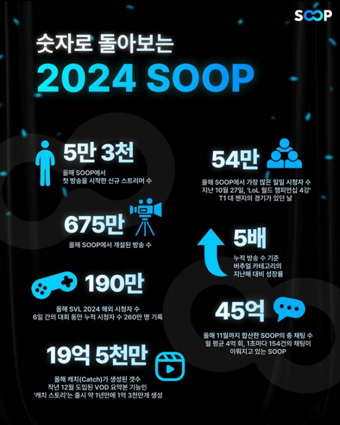 옛 '아프리카TV'가 SOOP으로 바뀐 올해 서비스 개선과 신규 UI(사용자 인터페이스)와 UX(사용자 경험)를 선보이며 대대적인 뉴 브랜딩을 선보였다. 아울러 신규 스트리머 유입과 콘텐츠 다양화, 플랫폼 생태계의 확장은 SOOP을 더 다채로운 모습으로 만들면서 다양한 기록을 경신하게 했다.