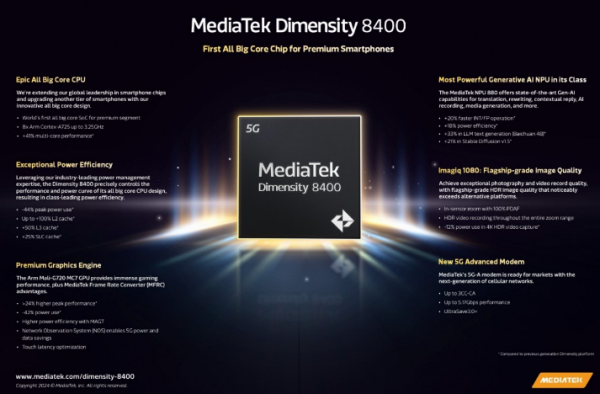 디멘시티 8400은 최대 클럭 속도 4.32GHz를 자랑하는 총 8개의 Arm Cortex-A725 프로세서를 탑재하고 있으며, 동급에서 가장 강력한 생성형 AI를 특징으로 한다. 또 게임 성능을 향상시키는 미디어텍 프레임 레이트 변환기(MFRC)가 포함된 Arm Mali-G720 MC7 GPU를 탑재하고 있다.