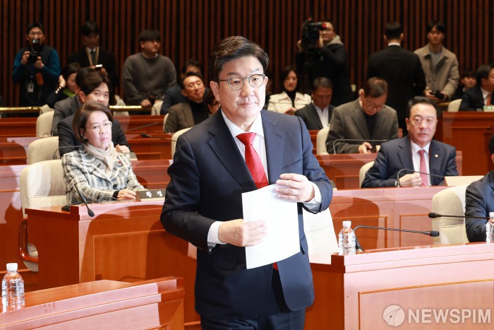 [서울=뉴스핌] 이형석 기자 = 권성동 국민의힘 원내대표가 24일 오전 서울 여의도 국회에서 열린 의원총회에서 발언을 위해 이동하고 있다. 2024.12.24 leehs@newspim.com