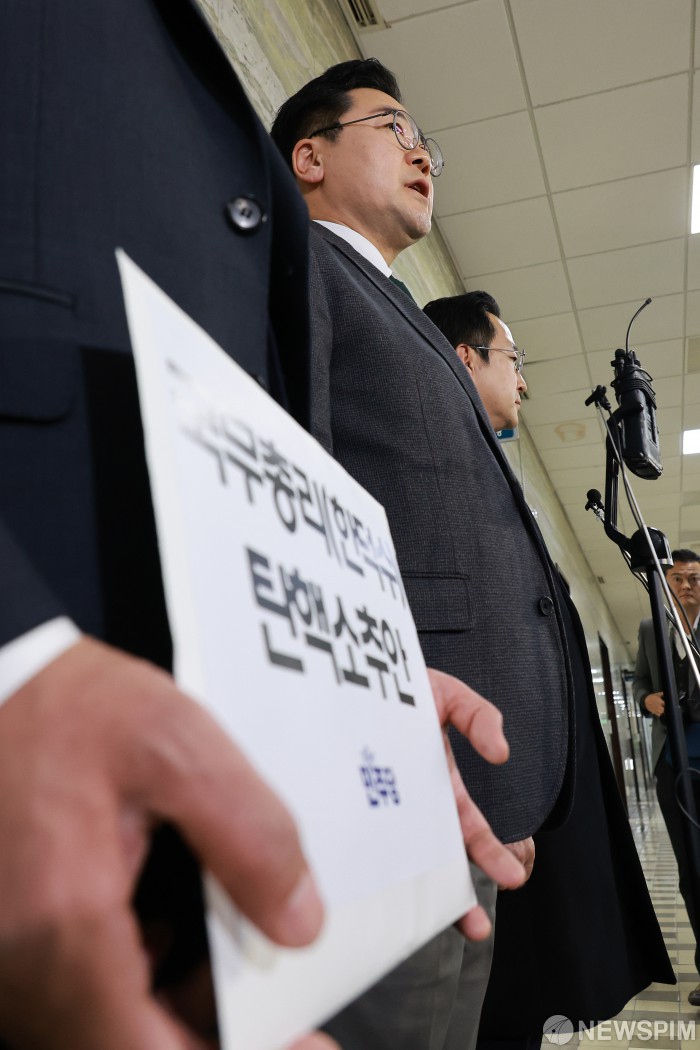 [서울=뉴스핌] 이형석 기자 = 박찬대 더불어민주당 원내대표가 24일 국회 의안과 앞에서 '국무총리 한덕수 탄핵소추안' 제출 보류 이유를 밝히고 있다. 2024.12.24 leehs@newspim.com