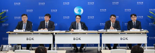 24일 오전 서울 중구 한국은행에서 열린 '2024년 하반기 금융안정보고서' 설명회에 (왼쪽부터) 양양현 국제기획부장, 서평석 금융안정기획부장, 이종렬 부총재보, 장정수 금융안정국장, 김정호 안정분석팀장이 참석했다. 한국은행 제공 |