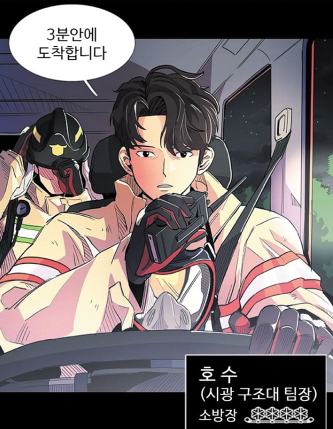 웹툰 '1초' 프롤로그의 한 장면. 시광 구조대의 전설적인 소방관 호수가 화재 현장으로 출동하고 있다. 긴장하게 되면 미래를 보는 능력을 가진 소방관 '호수'가 시민의 생명을 구하며 성장해 나가는 과정을 그린다. /네이버웹툰 |
