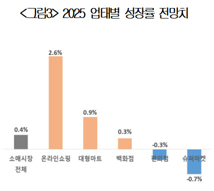 26일 대한상공회의소가 소매유통업체 300개를 대상으로 시행한 ‘2025년 유통산업 전망조사’를 보면, 내년 소매시장은 올해 대비 0.4% 성장할 것으로 집계됐다. 이는 지난 2020년 코로나19 팬데믹 이후 5년 만에 가장 낮은 수준이다. 올해 1~9월 성장률은 전년 대비 0.8%였다.