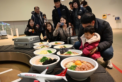 이스타항공은 이날 도쿠시마 첫 도착편 탑승객을 환영하며 수하물 벨트에 도쿠시마 라멘의 대형 모형을 전시하는 퍼포먼스를 진행했다.