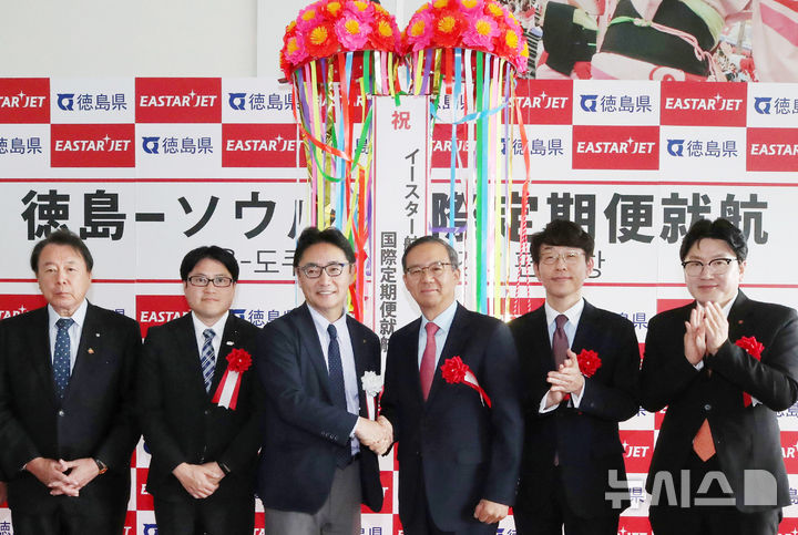 [도쿠시마(일본)=뉴시스] 전신 기자 = 조중석 이스타항공 대표이사가 26일 일본 도쿠시마공항에서 열린 '이스타항공 도쿠시마 첫 취항' 기념 행사에서 고토다 마사즈미 도쿠시마현지사 등 참석자들과 함께 취항을 축하하는 박터뜨리기 세리머니를 하고 있다.이스타항공이 국내 최초로 단독 취항하는 인천-도쿠시마 노선은 주 3회(화, 목, 토) 운항한다. 2024.12.26. photo1006@newsis.com |