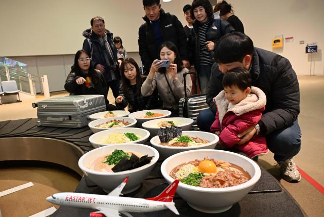 이스타항공이 도쿠시마 첫 취항 기념으로 도쿠시마공항 수하물 컨베이어 벨트를 통해 '도쿠시마 특산물 대형 라멘 모형'을 전시하는 행사를 진행했다. [사진=이스타항공] |
