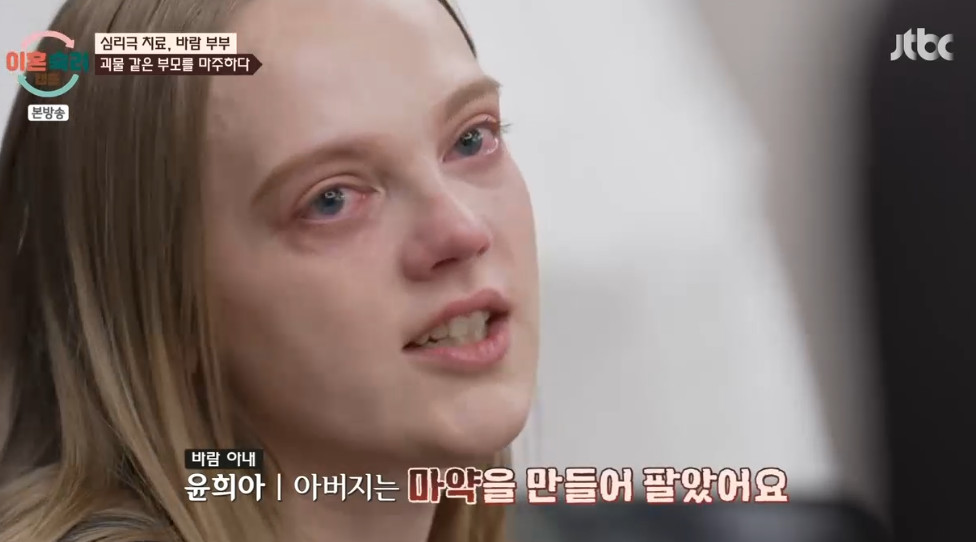 이날 바람부부 아내는 자신의 가정사를 묻자 "아빠는 마약 만들어서 팔았다. 맨날 싸워서 우리집 물건 다 던지고 나한테도 학대 많이 했다. 경찰이 거의 맨날 왔다. 그래서 저는 아버지 때문에 저는 고아원 갔다. 2년 동안. 가족이 너무 위험해서"라고 전했다.